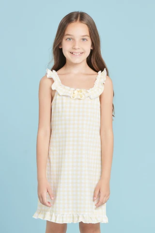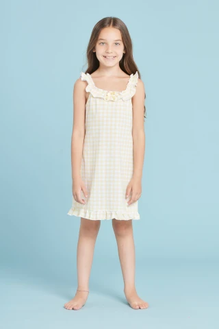 Abitino bambina cotone camille bretellina con stampa vichy e rouches e dettaglio fiocco