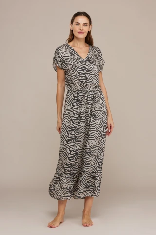 Abitino donna mare viscosa wild zebra manica corta,scollo a V,coulisse in vita regolabile e rouches sul fondo della gonna con stampa zebrata