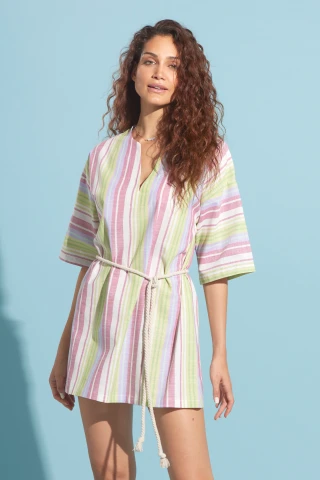 Abitino mare donna cotone colours con stampa a righe,manica a 3/4,scollo a V e dettaglio cintura di corda in canapa