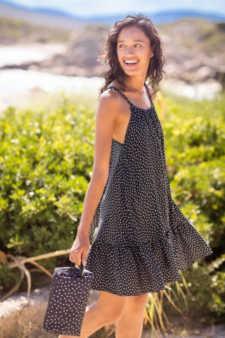 Abitino mare donna viscosa iasy con stampa a pois,con scollo con coulisse regolabile a bretelline e dettaglio rouches