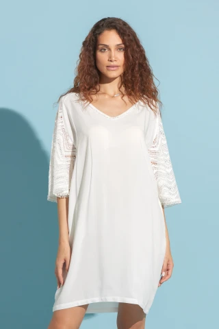 Abitino mare donna viscosa santorini tinta unita con scollo a V e manica a 3/4 in pizzo elastico