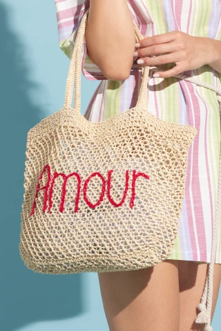 Borsa mare amour in cartapaglia con scritta rossa amour e chiusura a clips.