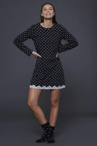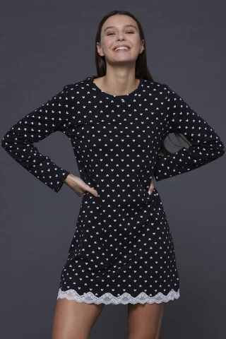 Camicia da notte caldo cotone cuore nero con stampa cuori e dettagli in pizzo bianco
