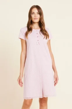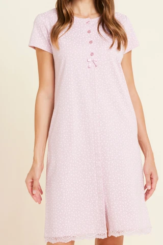 Camicia da notte donna cotone loredana manica corta con scollo serafino e abbottonatura nascosta sul davanti stampa a fiori e dettagli in pizzo