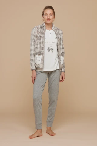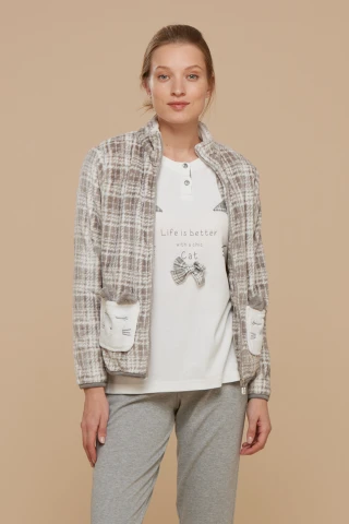 Completo donna 3 pezzi giacca bucle con zip con top panna con stampa e pantalone grigio con polsino