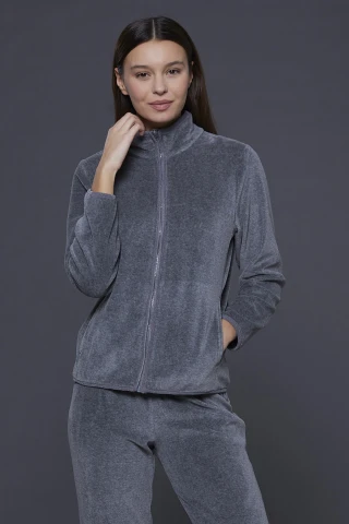 Completo loungewear donna ciniglia cora top grigio con zip pantalone grigio con polsino