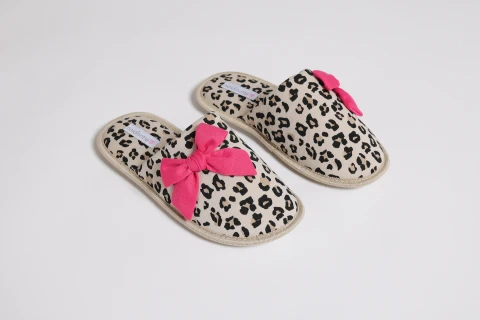 Pantofola donna cotone ghepy con stampa maculata e applicazione fiocco rosa