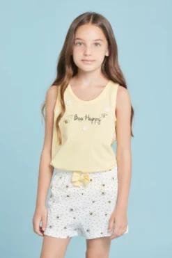 Pigiama bambina cotone apina pantalone corto panna con pois e apine stampate e fiocco giallo in vita, top giallo spalla larga con api stampate e margherite applicate