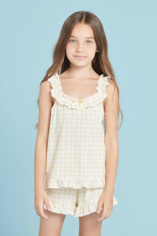 Pigiama bambina cotone ketty top bretellina con pantalone corto stampa vichy e dettagli rouches