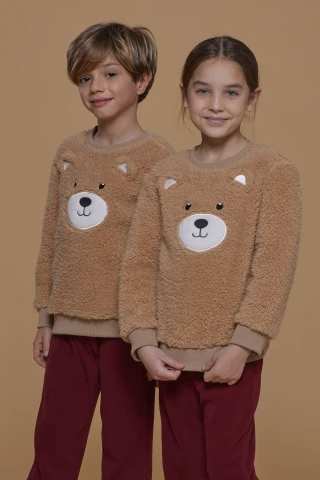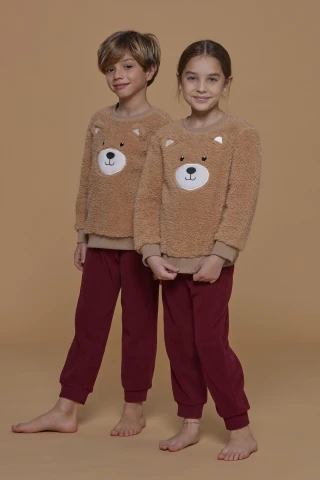 Pigiama unisex top eco-agnellino beige con ricamo e applicazione pantalone rosso micropile con polsino