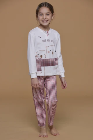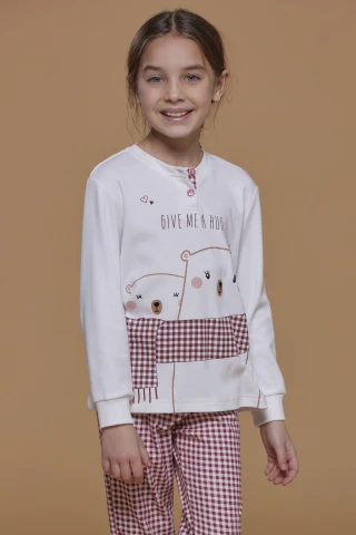 Pigiama bambina caldo cotone pantalone con stampa vichy con polsino e top panna con stampa e applicazione