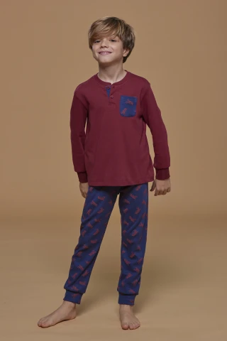 Pigiama bambino in caldo cotone top rosso con taschino stampato e pantalone blu con polsino e stampa dinosauri