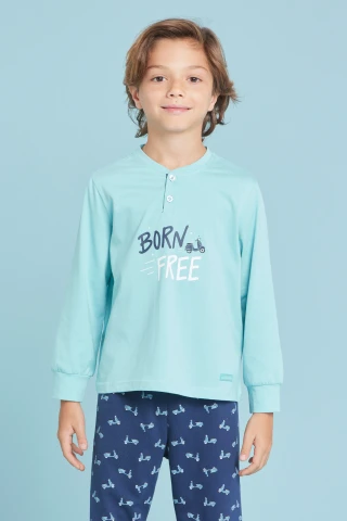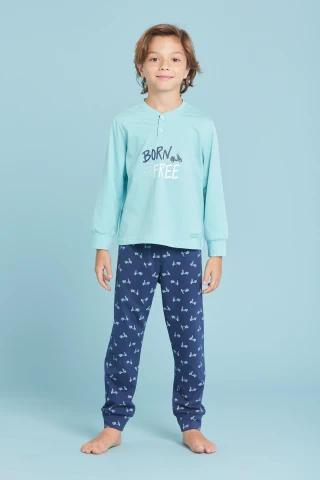Pigiama bambino cotone born free top celeste manica lunga con stampa e pantalone lungo blu con polsino e stampa allover