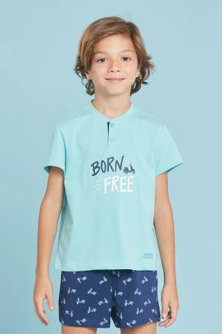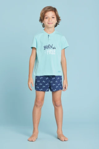 Pigiama bambino cotone just free top celeste manica corta con stampa e pantalone corto blu e stampa allover