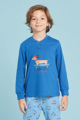 Pigiama bambino cotone skaters doggy top blu manica lunga con stampa e pantalone lungo con polsino con stampa bassotto allover