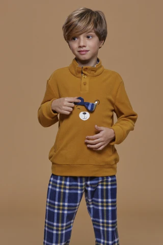Pigiama bambino micropile top giallo con applicazione e pantalone con polsino e stampa scozzese
