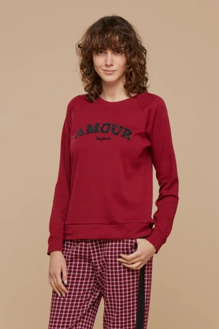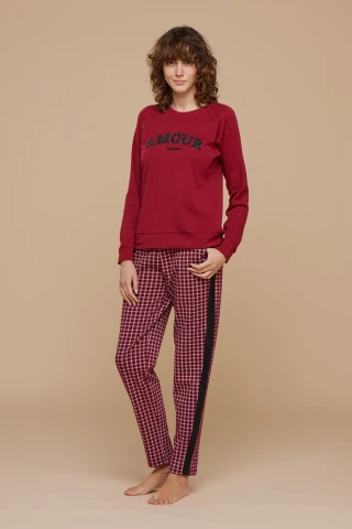 Pigiama donna caldo cotone felpato sandra con pantalone con stampa scozzese e top rosso con scritta amour