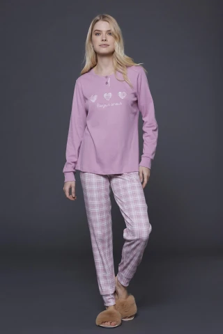 Pigiama donna caldo cotone bucle heart con pantalone con stampa scozzese e top rosa con cuori applicati