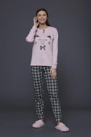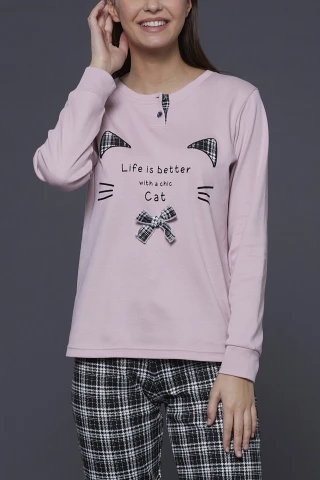 Pigiama donna caldo cotone buclè con pantalone stampato con polsino e top rosa con stampa e applicazioni