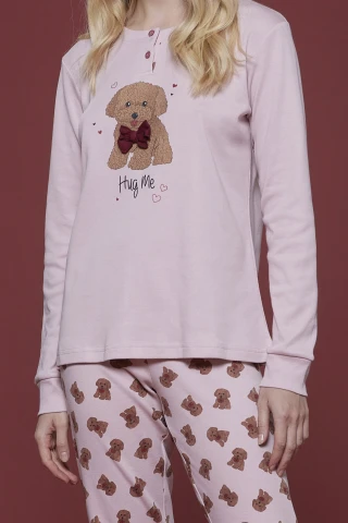 Pigiama donna caldo cotone con pantalone stampato con polsino e top rosa con stampa barboncino