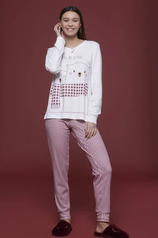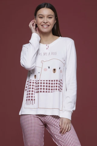 Pigiama donna caldo cotone hug me con pantalone stampato con polsino e top panna con stampa