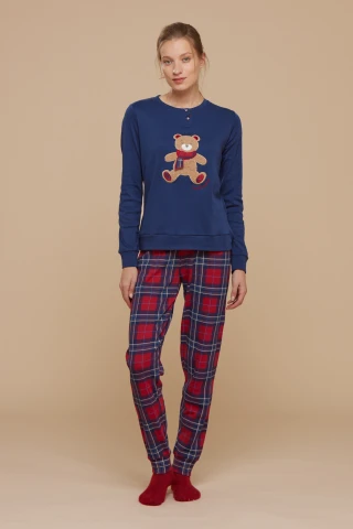 Pigiama donna caldo cotone little brown pantalone con stampa scozzese con polsino e top blu con orso in eco-agnellino applicato