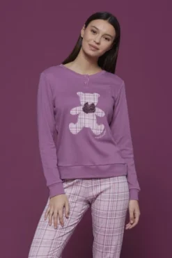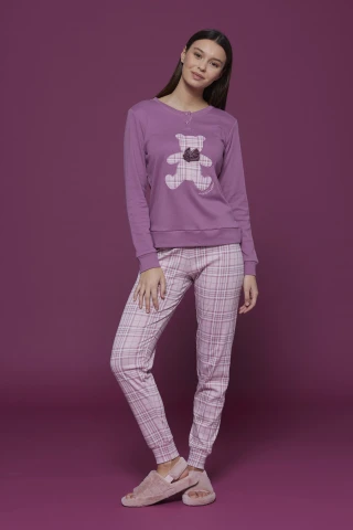 Pigiama donna caldo cotone mara con pantalone con stampa scozzese con polsino e top rosa con orso applicato