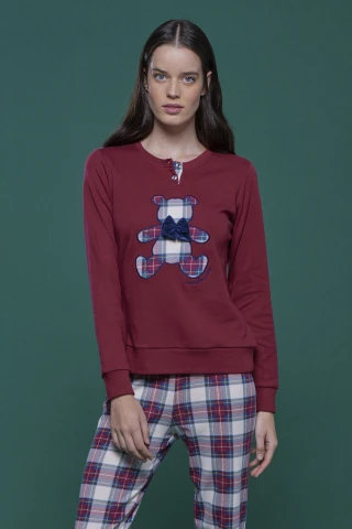 Pigiama donna caldo cotone newton pantalone stampato scozzese con polsino e top rosso con orso applicato i in pizzo