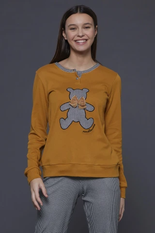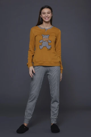 Pigiama donna caldo cotone orso con pantalone stampato con polsino e top giallo con orso applicato e dettagli in pied de poule