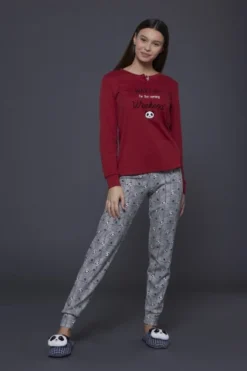 Pigiama donna caldo cotone pancipe con pantalone stampato con polsino e top rosso con stampa