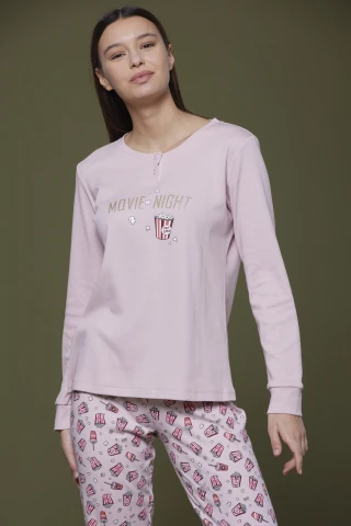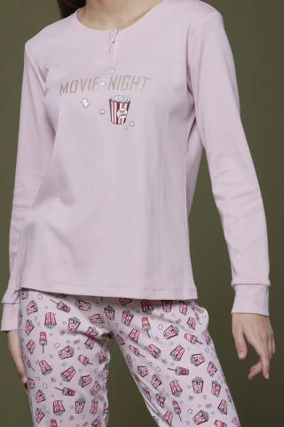 Pigiama donna caldo cotone poppy con pantalone stampato con polsino e top rosa con stampa glitter