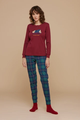 Pigiama donna caldo cotone sleepy con pantalone con stampa scozzese con polsino e top rosso con stampa e applicazione