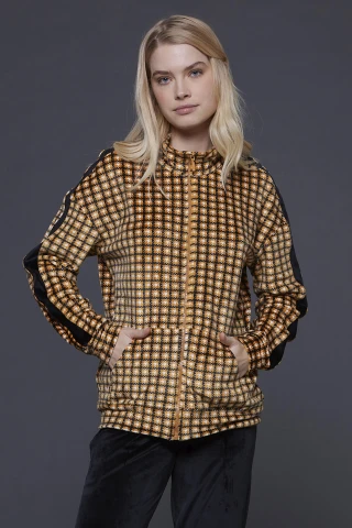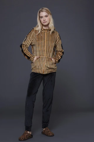 Pigiama donna ciniglia felpata soft touch top stampato con zip e bande nere sulle maniche pantalone nero con polsino