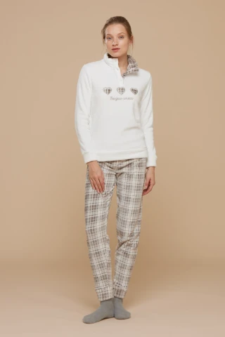 Pigiama donna in coral fleece con top panna con applicazione con cuori e pantalone grigio con stampa bucle