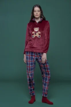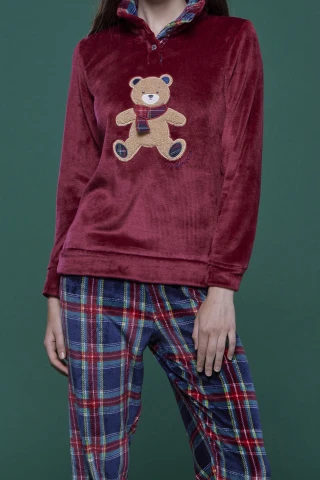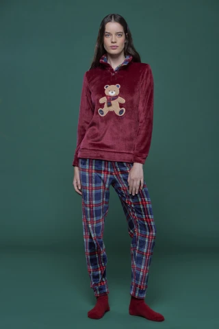Pigiama donna coral little bear con top rosso con orso applicato in eco-agnellino pantalone stampa scozzese con polsino