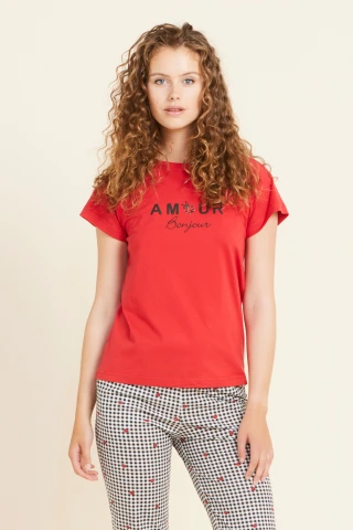 Pigiama donna cotone amour top girocollo rosso manica corta e pantalone pescatore con stampa vichy e coccinelle