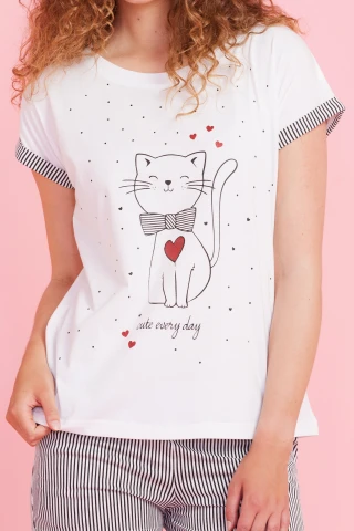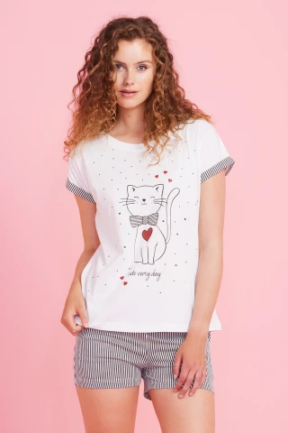 Pigiama donna cotone cute every day con top panna manica corta con risvolto rigato e stampa gattino, pantalone corto rigato