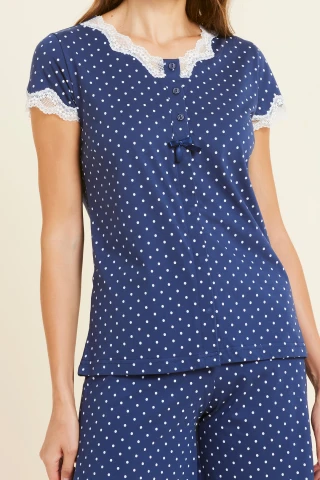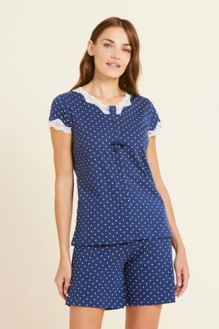 Pigiama donna cotone fancy con top manica corta con fantasia a pois dettagli in pizzo bianco e scollo con abbottonatura e pantalone corto