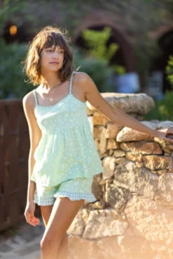 Pigiama donna cotone iole top bretellina pantalone corto con rouches e stampa con margherite e con dettagli in stampa vichy