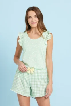 Pigiama donna cotone margherita top spalla larga con dettaglio rouches e stampa con margherite e pantalone corto con stampa vichy e fiocco