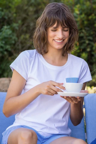Pigiama donna cotone nina top manica corta con dettaglio taschino a righe e pantalone corto a righe blu
