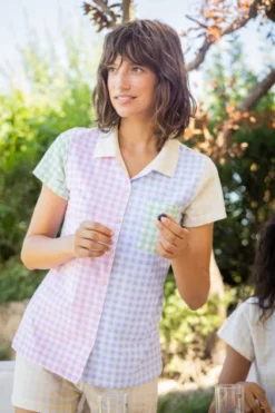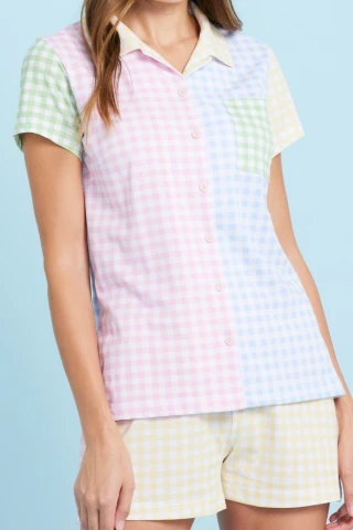 Pigiama donna cotone roberta top manica corta con stampa patch vichy multicolor ,colletto con rever e abbottonatura centrale epantalone corto