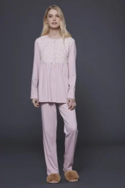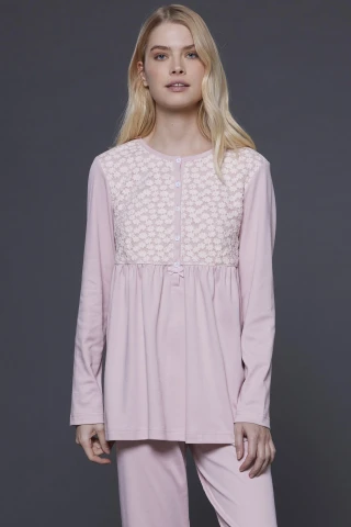 Pigiama donna luisa pantalone lungo senza polsino rosa e top manica lunga con dettagli in pizzo
