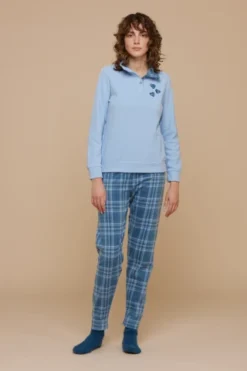 Pigiama donna mara con top celeste con applicazione cuori e pantalone con stampa scozzese con polsino