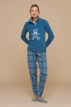 Pigiama donna max con top blu con applicazione orso stampa scozzese e pantalone con stampa scozzese con polsino
