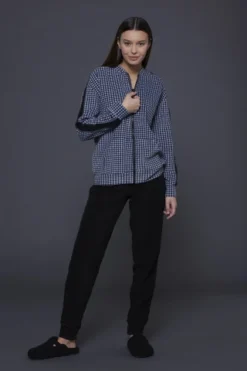 Pigiama donna piedipull top con zip e stampa pied de poule con bande nere sulle maniche e pantalone nero con polsino