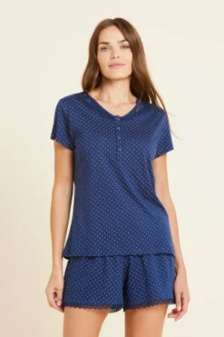 Pigiama donna modal sery con top manica corta scollo serafino e pantalone corto blu con stampa a pois e dettagli in pizzo
