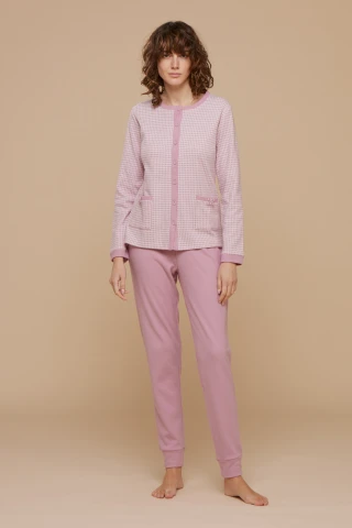 Pigiama donna punto milano piedipull con top rosa con tasche e aperto davanti e pantalone rosa con polsino