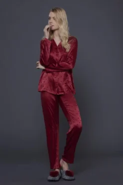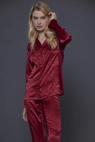 Pigiama donna cuore pantalone senza polsino e top abbottonato con cuori jacquard rever e scollo a V