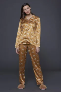 Pigiama donna macchia pantalone con stampa leopardo senza polsino e top con stampa leopardo abbottonato manica lunga con rever e scollo a V